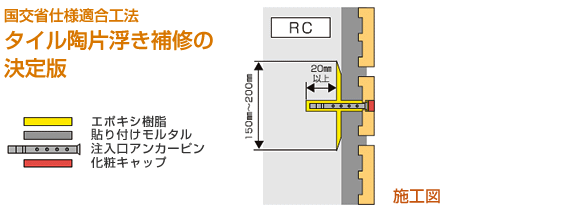 タイルの剥落事故は、時には人命に関わることにもなりかねません。タイル陶片の浮き補修の一つとして、国土交通大臣官房官庁営繕部監修の公共建築改修工事標準仕様書に「注入口付アンカーピンニングエポキシ樹脂タイル固定工法」が規定されています。この工法は、タイル表面に直接穴をあけ注入口付アンカーピンを挿入し、さらにエポキシ樹脂を注入して固定するもので、当組合のオリジナル工法「JKテラピン工法」がまさしくこの工法になります。タイル落下防止対策に、是非ご活用下さい。