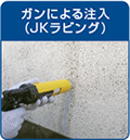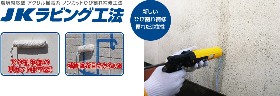 JKラビング工法は、短繊維を混入した特殊アクリル樹脂を使用し、耐久性や美観性、またひび割れ追従性に優れた、全く新しいひび割れ補修工法です。